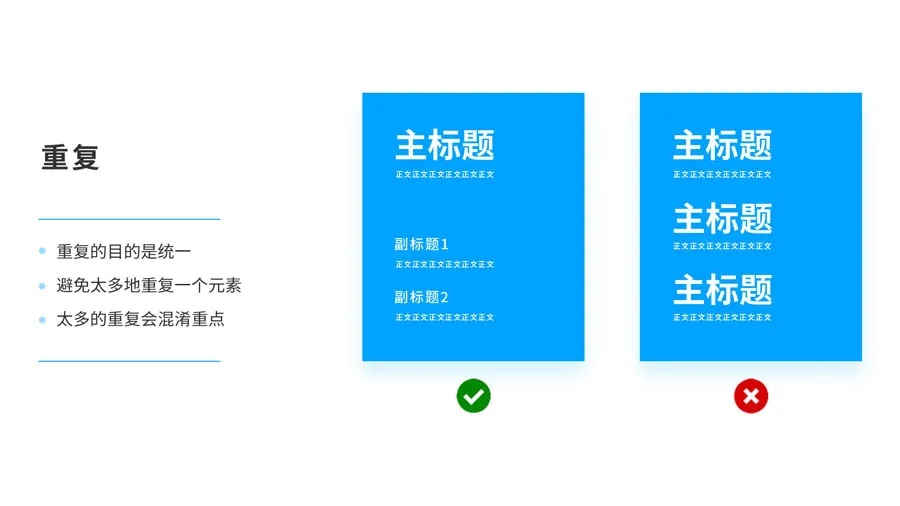 重復(fù)的目的是統(tǒng)一,并增強(qiáng)視覺效果。比如標(biāo)題都是同一個字體或大小或粗細(xì)。