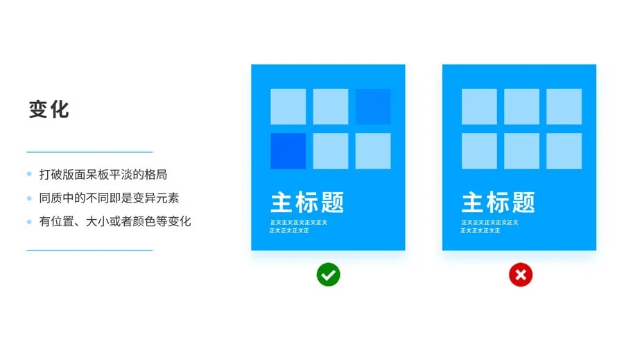 一成不變的元素會容易乏味無趣,版面也缺乏靈活感,如果將一些元素發(fā)生位置,大小或者顏色變化,打破版面呆板、平淡的格局,使得畫面非常有層次感,不失為打破格局的好方法。