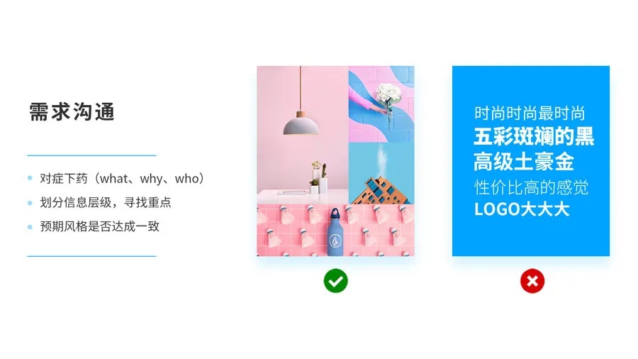 Ps:關(guān)于第3步風(fēng)格溝通,建議雙方用圖片交流和表達。畢竟每個人對“高大上”的理解都是不一樣的,有的人認(rèn)為是五彩斑斕的黑,有人認(rèn)為是大量的留白。