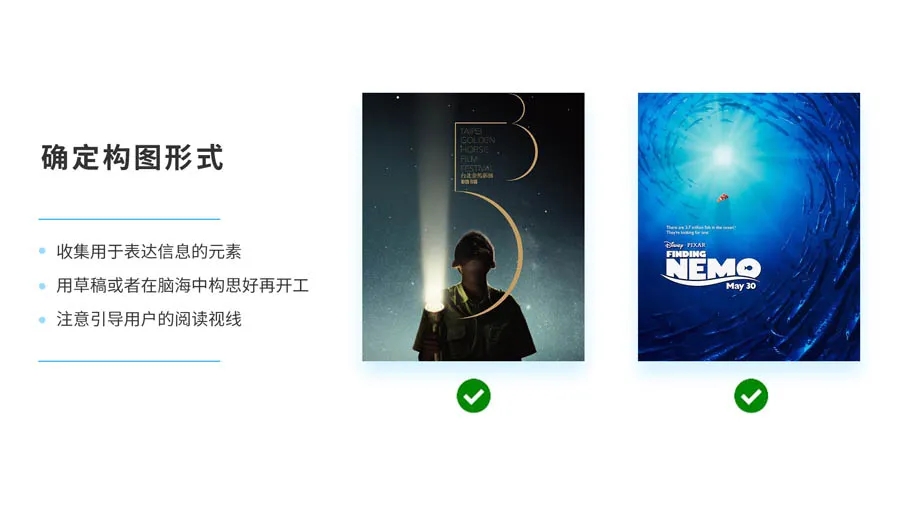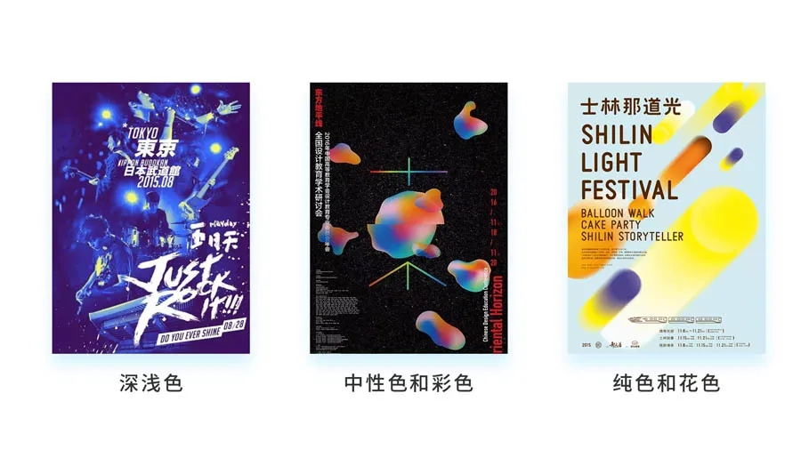 這里的深淺指的是黑白灰對比的重和輕,一般來說,色大而深顯得比較重要,色小而淺顯得比較次要,我們可以看一下前面講構(gòu)圖那塊展示的海報黑白版,會發(fā)現(xiàn)這個規(guī)律更加明顯。