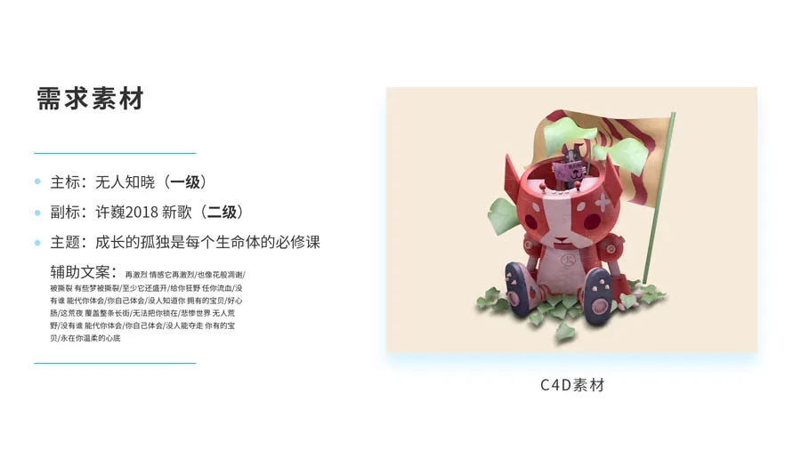 當(dāng)我們的工作內(nèi)容無法滿足做文字比較多的平面海報的欲望時,可以考慮自命題的練習(xí)。當(dāng)時聽到許巍《無人知曉》這首新歌的時候,有一些感悟和想法然后做了一些C4d素材,想利用它作為主體和歌名做一下排版練習(xí):