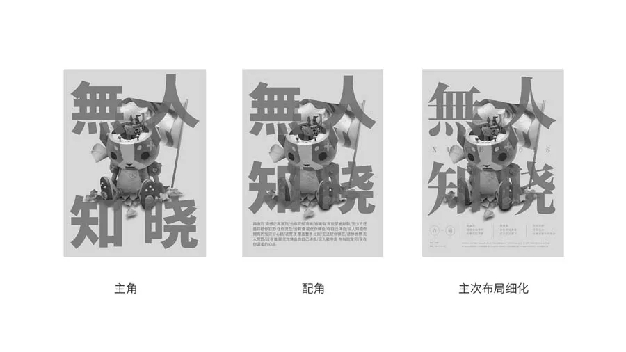 在開始動手做之前我就想好了這次想做一個視覺直觀而強烈的海報,再加上主體是文案和素材的結(jié)合,所以我才采用了滿版構(gòu)圖。在黑白灰中將主角和配角的位置確定好,再去調(diào)整字體和距離。