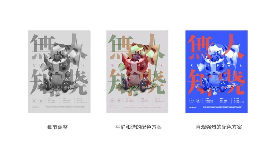 然后調(diào)整主體中4個字和素材之前的交叉和重疊,細節(jié)調(diào)整后,我嘗試了2個配色方案,一種是利用主體素材的顏色進行搭配,平靜和諧;另外一種是紅藍配色,直觀強烈。