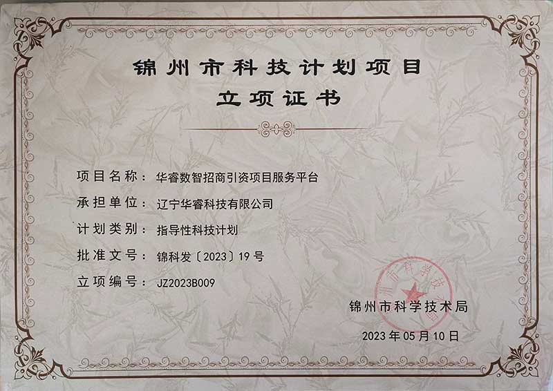 遼寧華??萍加邢薰尽?span style="white-space:normal;">華睿數(shù)智招商資項目服務(wù)平臺”榮獲錦州市科技計劃項目立項證書。
